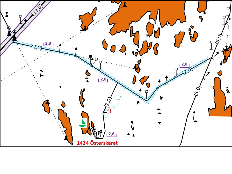 Djupsäkrad enskild farled (ingår inte i sjökort) till Kristinestads utfärdsbrygga. Färdigställd hösten 2015. Remmardimension 100 mm.