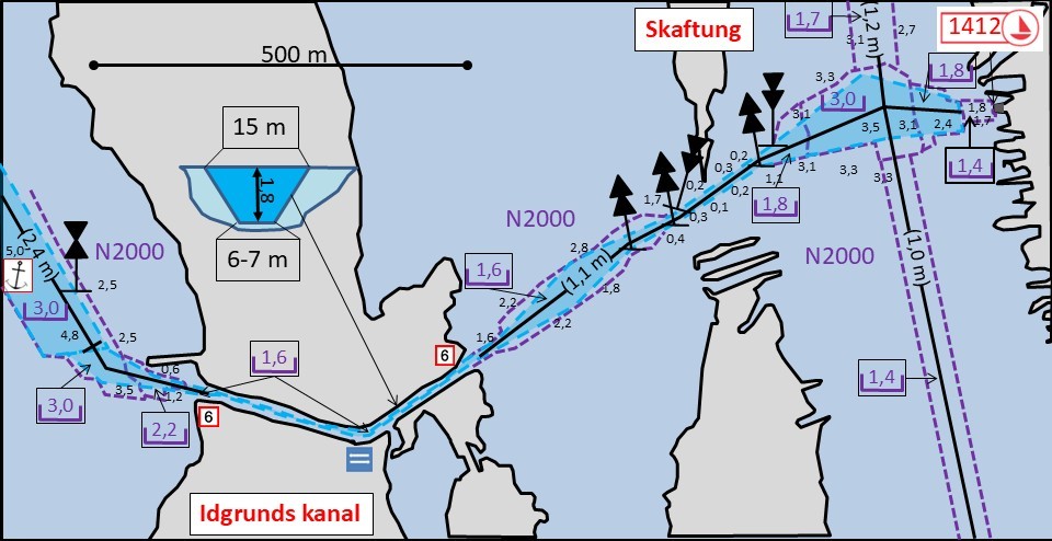 | Idgrundslinjen skär den så kallade Skaftungleden som leder upp från Kilen till Kristinestad. Skaftungledens ledgångsdjup utgör 1,2 meter. Djupet i Skaftungledens avsnitt mellan Kilen och Skaftung, Västra Ändan, är osäkert. Ramningen före 2000-talet har visat sig inte vara pålitlig och det finns punkter i leden som ger 1,4 m - 1,5 m djup (N2000) med sveplod. Leden är vacker och utgör en attraktion i sig. |
