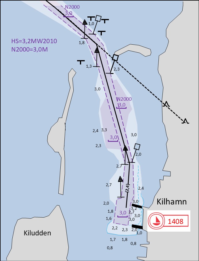 OBS: nedanom bryggan där djupet är antecknat till 2,7 m finns en liten hög med grävmassor, som blev kvar vid farledsfördjupningen år 2012, då farleden fördjupades med ca 1 meter.